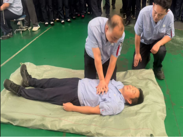 指令下達(dá),搶險(xiǎn)救援、醫(yī)療救護(hù)、警戒疏散、技術(shù)保障多組精銳聞令而動,火速集結(jié)。搶險(xiǎn)組披掛專業(yè)裝備率先抵達(dá),熟練運(yùn)用緩降器、擔(dān)架將“傷員”安全轉(zhuǎn)移至地面;醫(yī)療組無縫銜接,立即對“傷者”實(shí)施心肺復(fù)蘇、包扎止血等急救;警戒組快速清場布控;技術(shù)組同步展開事故調(diào)查和設(shè)備隱患排查。多組高效協(xié)同、配合默契,險(xiǎn)情被迅速化解。