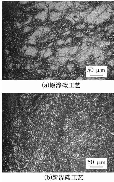 文獻(xiàn)[46]研究表明,高溫滲碳軸承鋼G13Cr4Mo4Ni4V滲碳過程中的碳勢(shì)一般控制在0.6%~0.7%,將擴(kuò)散階段的碳勢(shì)由0.6%降低到0.5%后,滲碳層碳化物細(xì)小且分布均勻,未出現(xiàn)網(wǎng)狀特征(圖3)。富Mo,Cr 等合金碳化物一旦在晶界形成,會(huì)使?jié)B碳吸附過程受阻,降低碳原子擴(kuò)散系數(shù),易造成大量碳原子在表面積聚,將嚴(yán)重影響滲碳軸承鋼的滲碳層深度和表面性能。文獻(xiàn)[48-50]研究發(fā)現(xiàn),在滲碳處理前向爐內(nèi)通入NH3,進(jìn)行預(yù)氮化處理能夠避免形成網(wǎng)狀碳化物,這是因?yàn)轭A(yù)氮化處理使表層中含有一定量的氮原子,氮原子在滲碳過程中會(huì)與碳元素及合金元素結(jié)合形成細(xì)小的碳氮化物。文獻(xiàn)[51]嘗試在滲碳軸承鋼初始表面鍍一層Fe-Ni膜,可以起到滲碳緩沖作用,其原理主要是利用碳原子穿越Fe-Ni膜需要一定時(shí)間,從而減小強(qiáng)滲階段進(jìn)入到材料表面的碳原子通量,同時(shí)減少了沿晶界擴(kuò)散的碳原子數(shù)量,使碳原子沿晶界擴(kuò)散更加有序均勻,減少網(wǎng)狀碳化物的形成。