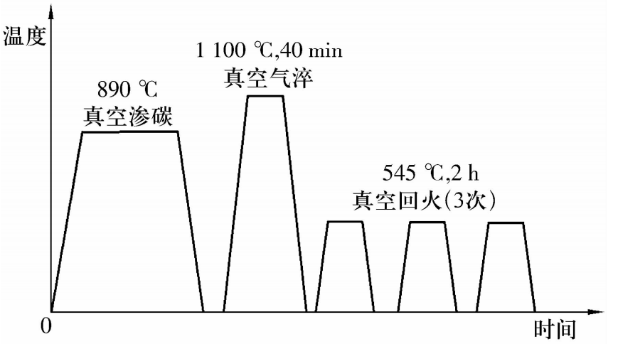 殲–20戰(zhàn)斗機(jī)和C919大飛機(jī)的先后問世代表了我國航空工業(yè)的崛起,而飛機(jī)機(jī)動性的每一次提升主要依靠發(fā)動機(jī)推重比的增加,如今發(fā)動機(jī)主軸dn值已經(jīng)達(dá)到2.4×106 mm·r·min-1,發(fā)動機(jī)主軸軸承的工作溫度逼近300 ℃,且長期承受巨大的沖擊載荷和循環(huán)疲勞應(yīng)力。為適應(yīng)航空軸承更高的性能要求,我國研發(fā)了第2代高溫滲碳軸承鋼G13Cr4Mo4Ni4V(ASTM M50NiL)。根據(jù)YB/T 4106——2000《航空發(fā)動機(jī)用高溫滲碳軸承鋼》規(guī)定,其經(jīng)過滲碳、淬火和回火處理后的表層硬度可達(dá)到62~63 HRC,具有較高的耐磨性和良好的抗疲勞性能,心部板條馬氏體提供了良好的沖擊韌性。圖7所示為G13Cr4Mo4Ni4V鋼常用的滲碳熱處理工藝,真空滲碳時的溫度一般為890 ℃,然后經(jīng)1 100 ℃淬火,再545 ℃回火處理3次,每次2 h。