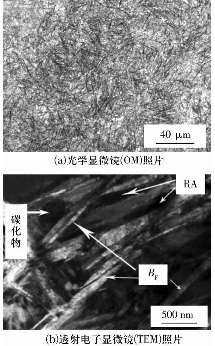 文獻(xiàn)[65]研究了貝氏體等溫淬火對G23Cr2Ni2Si1 Mo鋼滲碳層組織及性能的影響:在200 ℃下等溫8h后,滲碳層獲得了數(shù)量可觀的針狀下貝氏體(圖9a);圖9b中可以清晰地看到,在納米級的貝氏體鐵素體板條之間存在著薄膜狀殘余奧氏體。細(xì)小的貝氏體鐵素體板條使得相界面積大幅度增加,有利于阻礙位錯滑移,抵抗塑性變形,且富碳的薄膜狀殘余奧氏體可以有效阻礙微裂紋擴(kuò)展,因此有利于提高韌性和耐磨性。試驗證明,與傳統(tǒng)滲碳淬火相比,等溫淬火鋼的耐磨性提高了58% ,沖擊韌性提高了33.3%。