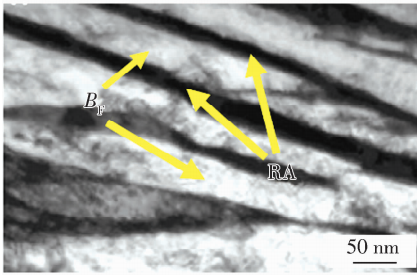 文獻(xiàn)[72]對20CrMnMoAl滲碳軸承鋼在220 ℃下等溫淬火 32 h后幾乎得到了全貝氏體組織(圖10),TEM觀察發(fā)現(xiàn),在貝氏體鐵素體條之間存在著僅十幾納米厚的殘余奧氏體薄膜,由于Al對碳化物的抑制作用,等溫過程中貝氏體鐵素體中的碳原子大量擴(kuò)散至薄膜狀殘余奧氏體中,因此薄膜狀殘余奧氏體的穩(wěn)定性更高,這對軸承尺寸精度的控制有一定益處。