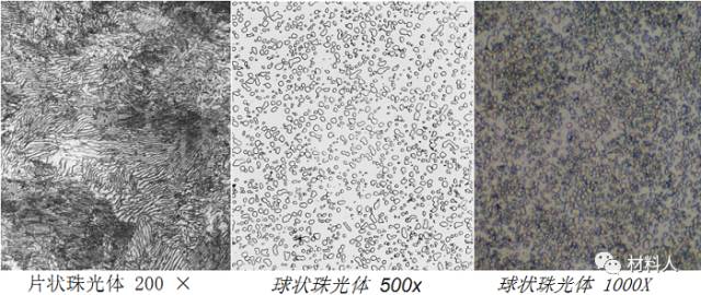 (2)球狀珠光體:經(jīng)球化退火獲得,滲碳體成球粒狀分布在鐵素體基體上;滲碳體球粒大小,取決于球化退火工藝,特別是冷卻速度。球狀珠光體可分為粗球狀、球狀、細球狀和點狀四種珠光體。