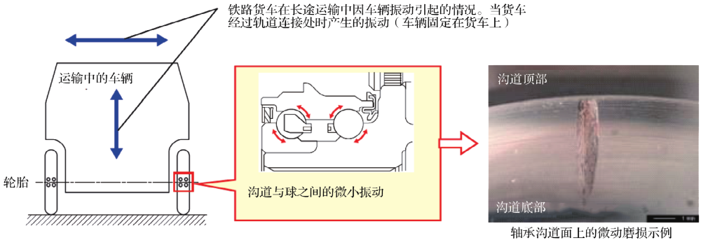 新制造的車輛在鐵路貨車上進(jìn)行長途運(yùn)輸時(shí),輪轂軸承的溝道與球之間會產(chǎn)生微小振動。如圖4中的箭頭所示,振動會擠壓出溝道與球之間的潤滑脂,產(chǎn)生金屬與金屬接觸,導(dǎo)致微動磨損。在潤滑脂趨于變硬和流動性降低的低溫條件下,微動磨損更明顯。在這種情況下駕駛車輛可能會產(chǎn)生異常聲。