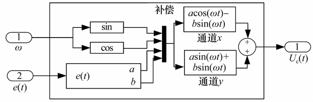 文獻(xiàn)[37]提出了一種尋找不平衡質(zhì)量位置的算法,通過(guò)如圖13所示的補(bǔ)償模塊將轉(zhuǎn)子轉(zhuǎn)速作為輸入,根據(jù)實(shí)時(shí)提取的轉(zhuǎn)子不平衡質(zhì)量的大小和位置產(chǎn)生相應(yīng)的控制信號(hào),從而抑制不平衡振動(dòng)。由于該不平衡質(zhì)量與轉(zhuǎn)子轉(zhuǎn)速無(wú)關(guān),該算法也適用于變速轉(zhuǎn)子。